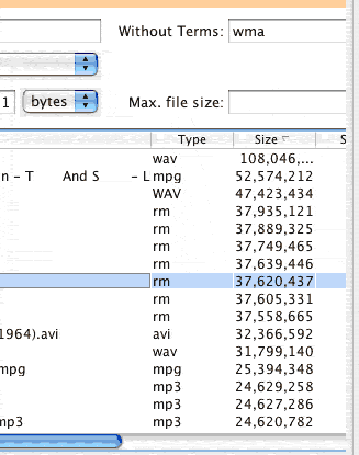 Search results window on osx limited - no vertical scroll bar It seems I can't scroll to the end of the downloads. Am I missing something here? I get the list of top # of files on list but can't scroll down. No matter which way I arrange the files ... by size or name, etc. Any clues? There should be a vertical scroll down bar on the right column, similar to the horizontal scroll bar. But there's not. The size limiter was 1 byte btw. |