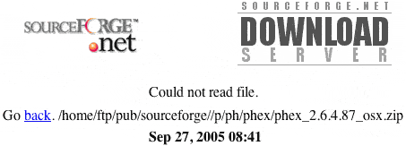 | I thought I'd try out Phex. Following on from this Thread's link I ended up here http://www.phex.kouk.de/mambo/content/view/17/29/ but I received error messages attempting to downld no matter which browser I used. However, at http://macupdate.com/info.php/id/19449 the file downlded fine, which I got from the link at the bottom of the 1st Sticky. So what's the problem with the other downld link? Is the server a bit overloaded or something?