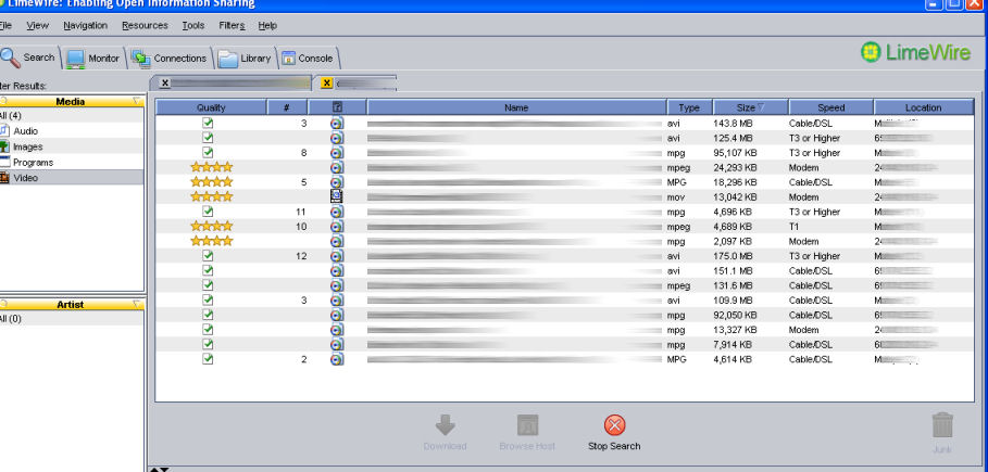 | I"m running Limewire 4.12.3 Pro (java 1.5.0_06) on Windows XP sp2. When I get results back from a search, I want them in filesize order descending. when i click on the size column so the arrow points down I get some files that sort OK... then in the middle of the list it seems to start again from smallest to largest. I attached a picture. Sorting used to work fine... I want the results all sorted regardless of whether I already have the file, or if it's marked junk. It used to do this. Any ideas?THanks. |