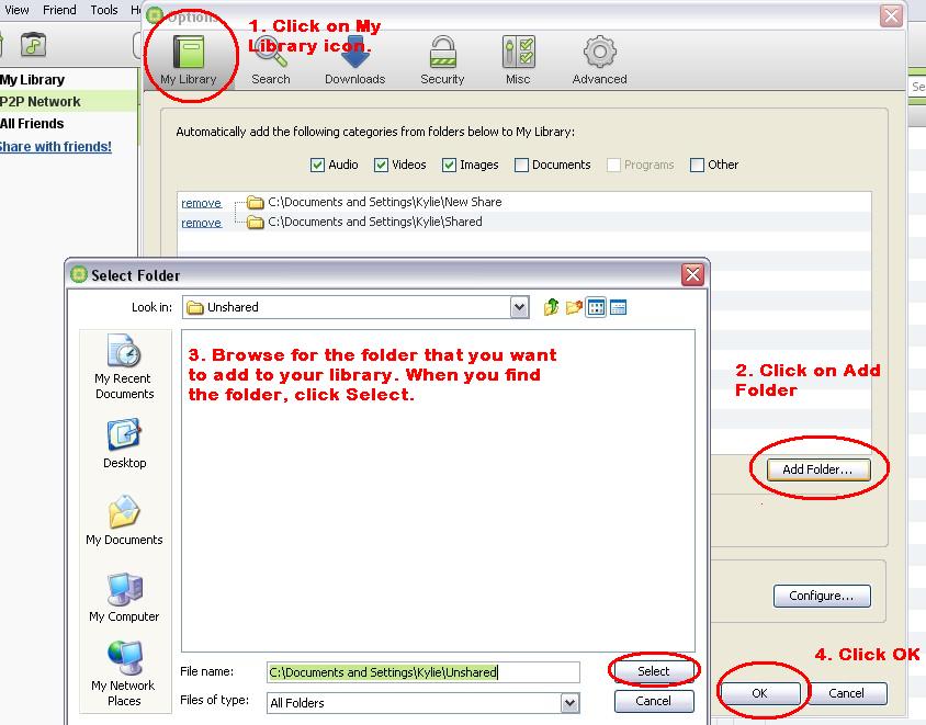 LimeWire 5.0 - Adding folders to library, sharing/unsharing files, removing folders - Windows. 4 Attachment(s) To add folders to your LW library using Windows... 1. Drag folders into LW's My Library. Click on thumbnail to enlarge the image. Attachment 4668 2. Click on File > Add Folder to Library. Click on thumbnail to enlarge the image. Attachment 4640 Or, you can click on LW's Tools > Options, then click on the My Library icon. 3. Navigate to the folder that you want to add to the library. Click on that folder, then click on the Add Folder(s) button. Click on thumbnail to enlarge the image. Attachment 4642 4. Close the options page. Click on My Library in LW's sidebar. You'll see that files from the new folder have been added, but they're not shared yet. Click on thumbnail to enlarge the image. Attachment 4643 If you want other people to be able to download those files, you'll need to share them. Mac OS X users can find info by clicking on this blue link: How do I set "shared" folders in Limewire 5 Pro?? |