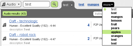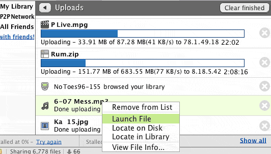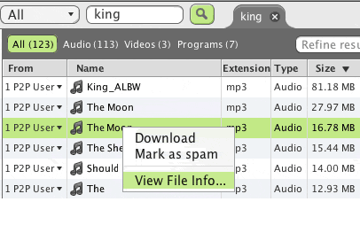 | LW 5 has two view options for search results. One is List View mode which is the default. There is also Classic View. You decide which one you prefer. For those who have used LimeWire 4 (or FrostWire-4, Cabos or Acqlite), you will be more accustom to Classic view, as shown here: 'Classic View' for search results Below is List Mode with some explanation what each tool does. You can filter your search results via Refine Results window. You can also organise your search results using the Relevance drop down menu. Numbers of hosts with each file is shown in middle next to p2p users. The + sign to the far right will show those that are similar. The i button will bring up an information window describing the file. You can click the top right-corner of the info-description window to do a bitzi lookup to check upon the file (note: as of 2015, the Bitzi Lookup tool is now non-functional because the site closed down.) Right-click the preferred search result and Download file. LW 5.1.2 or later simply click on file in search results will start it downloading. Below is a sample Search results in the Default List View mode. Results can be refined by (a) typing in a word to refine the results or/& (b) categorized via a Relevance drop down menu. Relevance menu items vary depending upon category-type of search. ![]() Only 10 search tabs possible in LW 5, and only 3 will show at any time. To see the other earlier search results, click on the More button. (Each earlier searches after the 10th will be lost.) Also, to arrange your search results, click on Relevance to arrange by your preferred method. ![]() Below is Classic view, but identical to options in List View for downloading a file from Search results. The green Down arrow represents downloading. The Book icon represents finished or previously downloaded (same icon as Library icon.)![]() Advanced Search options are available. Go to Tools menu & choose Advanced Search, click on the media type you wish to search for. Example below for Audio type search (or click on Advanced link beside Search box): To get more search results, right-click (Mac users Control-click) the search tab & choose from menu. ![]() Once downloads have started, you can see them at bottom of screen. The LW 5 Download window is visible at all times; as soon as LW opens, if you are viewing Library or Uploads windows, your Download window will be visible at all times. The sample image below shows this. It also shows you how you can organise your incomplete downloads; via Name, Order Added (Date added to downloads), Status, Speed, Time Left, File Type or File Extension. You can also Reverse the order. ![]() * Cancelling download files deletes the incomplete file in LW 5. Preview / Play files see Previewing Videos (click on link). Warning: Previewing files still creates a Preview file stored in the LW incomplete folder. To access incomplete folder, right-click any file in Download window, choose View File Info.... Then in the information window, click on the Locate on Disk link & it will take you to the incomplete folder. Uploads Uploads can be accessed via Tools menu. You will notice via the sample image, those who browse your files are also shown. This can be helpful to know if people are viewing & uploading your files. Each upload is shown separately. You also have the option to open your own shared upload file. For more on how to share, see How to Share Folders (click on link). Option to clear uploads can be set in options or done manually. To know about how many uploads & upload attempts & how many times your files have been found in searches, refer to the How to Share Folders link & see point 1 (c) about viewing Library window. A big difference between Locate File option & the previous Explore button is that Locate File takes you directly to the file itself, not the parent folder. ![]() ![]() * Right-click any file in your Library, p2p Network, or Upload windows & choose Locate File or Locate on Disk to be taken directly to that file & folder, which will open up on your desktop with the file in question highlighted/selected. . Last edited by Lord of the Rings; August 27th, 2009 at 01:52 AM. |