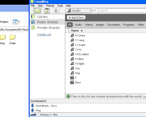 Clicking on the My Files icon will show the sidebar, where you can see LW's Library, Public Shared, Private Shared & whatever lists you've created. Files in Library aren't automatically shared with other users. Public Shared lists the files that you're sharing with the Gnutella network (so that they're available for download by other users). Private Shared lists the files that you aren't sharing with everyone but might share with friends if you use the Friends feature.