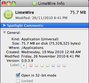 On Dec 11, 2010, a project was registered at SourceForge under a new name WireShare claiming to be LPE. But not much happened other than renaming the program. Thanks to the LPE/WS team for doing this. However, using the WireShare source code, a community & forum member has released the equivalent of LPE 5.6.3 with the new name WireShare. . (Volunteers are welcome.) Attachment 6707 WireShare 5.6.4 . (publicly released mid-March 2014) Some bugs that exist in LimeWire Pirate Edition have been fixed in WireShare, including some other improvements. Windows version: Mirrors: . MF Mirror, . Google Drive (2 clicks: down-arrow or click file-name), . . SourceForge. MacOSX version: . (Compatibility @ Intel with OSX 10.5 or higher with Java 6 or higher. @ Older machines: OSX 10.6 or higher with Java 6. Need to install Java first unless you upgraded from OSX 10.6 or earlier. WireShare 5.6.4 or later will now run with Java 7 or later. If you also have Java 6 installed then that version will be used. * If using MacOSX 10.8 or later, set the program to 'Prevent App Nap' otherwise App Nap will continually drop all active connections between every 15 to 120 minutes if not actively using the program. In Finder, use the Go menu on the toolbar & choose Applications (else keyboard shortcut is Shift-Command-A.) Find WireShare and control/right-click the program and choose Get Info. Check the option for 'Prevent App Nap'. Also disable the option to 'Open in 32-bit mode'. Desktop computers don't need App Nap in any case!!! MF Mirror, . . Google Drive (2 clicks: down-arrow or click file-name), . SourceForge. Linux version (Debian/Ubuntu): MF Mirror, . . Google Drive (2 clicks: down-arrow or click file-name), . SourceForge. Linux RPM distro version (OS/2, Solaris, Linux, Red Hat, Fedora, SUSE, Mandriva, etc.): MF Mirror, . . Google Drive, . SourceForge. LimeWire Pirate Edition 5.6.2 (abbreviated LPE - released 9 Nov. 2010) Attachment 6709 (Startup Splash-Screen difference, File_Girl's version lower image portion) Windows version: (Windows 8 users will need to install Java and set the installer to Run as Administrator to use LW. Win 7+Vista users do the same.) File_Girl71's version (released 12 Nov. 2010): . LW Pirate Edition improved, download via SaberCat (File_Girl) (Recommended) / Mirror download sites: Download via GoogleDrive or via 4Shared. Original Metapirate's LPE: Download via SaberCat Download from Google Drive Download from 4Shared MD5 of installer: 7a96f2da87a7cfc6f10ab6a325ec0e48 * Known Windows issues: (The Windows versions have java fixes included within the install package.) (a) LimeWire 5/LPE running with Java 7? Important to see this . ou Francais ici, however LimeStart will by-pass this problem if you choose to install it (LW Setup now replaces the need for LimeStart!) . . (b) 64-Bit Java 7 update problem: re-install the 32-Bit Java last and all will be ok. Symptoms: (a) java error when opening LW, (b) LW changing it's download location and location of settings, and unable to connect. (Fixed in WireShare 5.6.3) Two other issues and workarounds: (1) LW freezing when changing download location (Java 7 only bug): Need to change it manually. (2) "Done but unable to scan for viruses" (this also prevents music transfers to iTunes.) This problem was fixed in the WireShare 5.6.4 version. Mac version: - OSX 10.5 or higher (MacOSX 10.10 Yosemite +10.9, 10.8, + 10.7 users will need to install Apple's Java 6 first before using the LimeWire installer. Latest Apple Java 6 2014 here, or Java 6 for 10.7-9 2013 to use LW. Alternate link Java 6 for OS X 2013-005 via Apple - update for OSX 10.7-10.9). MacOSX 10.8 or later Security permissions for downloading can be set in the System Preferences: Sample image Download via SaberCat Download from Google Drive Download from 4Shared * If using MacOSX 10.8 or later, set the program to 'Prevent App Nap' otherwise App Nap will continually drop all active connections between every 15 to 120 minutes if not actively using the program. In Finder, use the Go menu on the toolbar & choose Applications (else keyboard shortcut is Shift-Command-A.) Find LimeWire and control/right-click the program and choose Get Info. Check the option for 'Prevent App Nap'. Also disable the option to 'Open in 32-bit mode'. Desktop computers don't need App Nap in any case!!! If using an older mac with 10.5 or later, you may need to set LW to 'Open in 32-bit mode', instructions lower down in this post. MD5 of installer: d827a7ce4e64d4d4546f6b59f5b60ca1 Linux version (Debian/Ubuntu): Download via SaberCat Download from Google Drive Download from 4Shared (Need to be a member of 4Shared to download files.) linux_lwSettings_Connect_LimeStart.tar.gz (includes Linux LimeStart, Spam search filters, Connection file, optional Security blocklist.) Also a 7z compressed option at 1/3 the size. Optional Security packages for Linux LimeWire MD5 of installer: e7de0b7ee7fa5305407886d965b38661 Source code: LPE 5.6.2 Browse or download from github LimeWire 5.4.7 Source Code via AfterDawn To download from 4Shared, you need to be a member of their site. You can register there for free. Try to ignore the advertisements and sponsored download buttons. All Windows and MacOSX versions are now packaged with an optional security installer to help block out the very worst spam companies. The MacOSX package includes LimeStart by LOTR to prevent LW deleting the connection file if not used in 30 or more days. Instructions are included and order of installation for each. Linux users for manual installation of the Security packages, see Security packages for LimeWire (help block out the spam and evil hosts). Windows LPE install packages also include a LimeStart installer, as described here. This has two functions: (1) prevents LW deleting the connection file if not used in 30 or more days. (2) Overrides the LW launch problem with Java 7. (Note for Windows users: Lime Setup now replaces the need for LimeStart!) There is now a Linux 