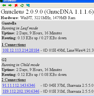 But first, before you panic. Did you put Gnucleus in your firewall exceptions? Go to Control Panel, open up the firewall, click on Exceptions tab, then the Add Program button or similar depending on which firewall software you are using. And choose Gnucleus to add. To my knowledge, Gnucleus does not have UPnP support. Thus if you are using a NAT modem or router, then you should port forward a port for it such as 6346 or 6348. If you earlier ran any other file-sharing program using the same ports as Gnucleus during the same boot session, then you should reboot your computer. Routers will reserve a port per program per boot session. In general, with exception of initial opening of Gnucleus, I found Gnucleus v.2 only connected to one or two peers for the gnutella network, and two hosts for G2. Search results were quite ok though. But you do need to add your own filter words of course. Gnutella connections and G2 connections are shown in separate windows, you need to check which option you wish to see at the time. If you use the Browse Network from Tools menu, then you can see both in detail at once. The browser works on my v.2.0.9 (the others are closed down at moment.) I am guessing yours is blocked via a firewall of some description. Perhaps some other kind of security software? The fact the browser is not working for you highly suggests a security software on your computer is blocking Gnucleus's full access. Browser (from View menu): One thing about File_Girl's Gnucleus 2 versions is she included an updated built-in GWeb-Cache, and a basic block-list and clean installer. Important note about Gnucleus version 2, do not expect to see a window full of gnutella connections. Expect to see two G2 connections (click the G2 option to see the G2 connections) and one or more gnutella connections. I suspect it was designed that way. I found version 2 only connected to multiple gnutella peers when it first started up. File_Girl might be able to correct me on that. ![]() To see your connections in detail, go to the Tools menu, choose Browse Network. Browse Network Connections (from Tools menu): (Host addresses changed to protect privacy.) |