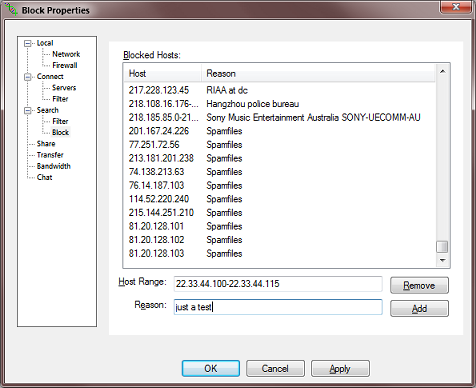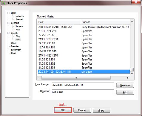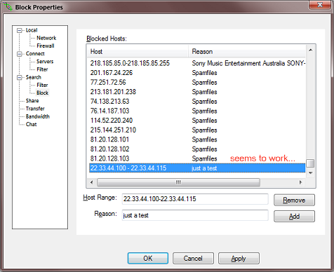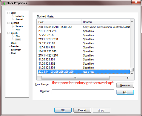 | Hi, I've just registered here because I'm literally tearing my hair out with this thing. To me, it simply seems a bug in 2.2.0.0 (latest). I thought I could simply do a aa.bb.cc.dd-ee.ff.gg.hh using a simple hyphen ( - ) for blocking a range of hosts, but this doesn't seem to work. You can try it yourself: everytime you leave the settings and go back into the Preferences dialog again, you will get this auto-transformed to the following instead: aa.bb.cc.dd-255.255.255.255 What am I doing wrong here? Thanks for any help... Last edited by gnutrition; May 3rd, 2009 at 03:15 PM. |