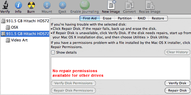 Repair permissions will 'ONLY' show for the system drive. Repair permissions option will not show for a non-system drive.