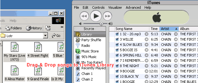 * B 2. Whilst you can drag & drop songs from the desktop to iTunes, you can also drag & drop them directly from LW's Library window. _ (click image below to see larger view) __ (* Warning: this technique may not work properly with some LW 4 versions. But does need to be done from the correctly chosen folder.)