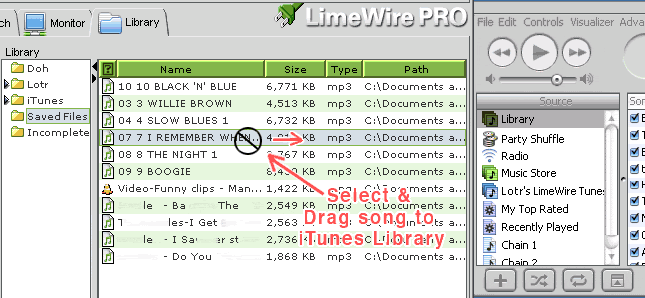 (If using LW 5, see Using LimeWire 5 to find your files on your computer using 'Locate File on Disk', however in LW 5 you can set in Option settings to allow iTunes to automatically import songs into its music library.) For LW 4: You can select Saved Files folder in LW & press Explore button & the folder will open up for you. Then you can drag & drop songs from there to iTunes 'Library' icon above the playlists. Select multiple files at once by holding down the SHIFT key as you select them. * This is by far the best & most efficient technique of adding music files to iTunes. If music files will not add to iTunes as shown, then they have either been previously added, else the files are fakes/corrupt. But be aware iTunes can only import mp3 & m4a/mp4 files. iTunes cannot import wma (it can convert wma files), real player files, mp3pro, flac or ape files. iTunes can only import Ogg Vorbis files 'if' a 3rd party plug-in is installed. Last edited by Lord of the Rings; May 29th, 2010 at 09:01 AM. |