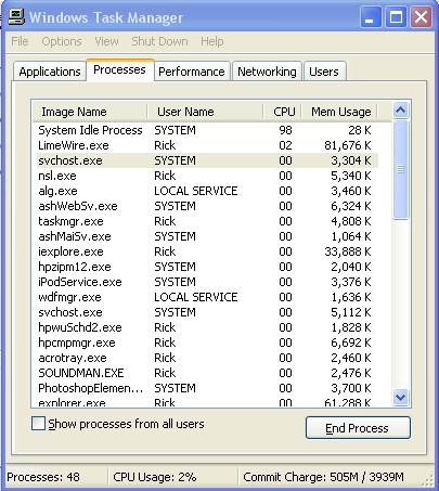 CPU Intel P4 X.XGhz How much ram I am a little concerned that you are using 10% CPU when Idle it should be 0% to 2% the task manager should say System Idle 99% most of the time when you don't have limewire running. Unless you have something else running. |