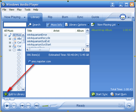 1. Open WMP…click on library tab…’Add to Library’ (see arrow)