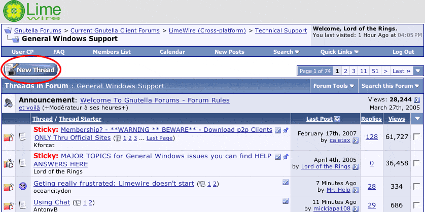 | New to forums? Check the FAQ to help get you started Forums, Threads and Posts ![]() Find the section of the forum that most suits your topic. And double-check by looking at the short description of the purpose of the forum section just near the top of the page. eg: above you will see Site Feedback For feedback on Gnutelliums and Gnutella Forums. For feedback on a specific Gnutella client, please post in one of the forums above; ie: Current Gnutella Client Forums Then find and press the New Thread button just below that description to the far left of the page near the top. This will allow you to create your own new thread. Of course, you should detail your thread as to your problem, details of your computer system, etc. http://www.gnutellaforums.com/genera...od-thread.html is a simple guide and for system details: System details - help us to help you (click on blue link) and post in accordance with the Gnutella Forum RULES. ![]() Before you post a new thread, do a forum search to see if a similar problem has not been previously answered using forum search function & checking forum section posts, and if there are red Sticky's at the top of the forum section, then be sure you have had a look to see if there's no previous answer to your issue. Example of a Sticky: http://www.gnutellaforums.com/open-d...sion-help.html. Stickies are answers to commonly asked questions. ![]() See sample image below to create a New Thread & see what Sticky listing looks like in a section index listing: Attachment 4057 (click attachment to see large view) New to forums? For more information about how this forum works, click on the FAQ link here or above. A thread is the entire collection of posts under one topic. A post is an individual post by a single member. Links are the underlined words in blue which will show an orange color if you hover your cursor over top. Clicking a link will take you to a different url page on the forum or a different site. Members sometimes give links to help you find your answers easily & quickly. ![]() Who are the forum leaders: Forum Leaders page, which lists the Administrators, Super Moderators, Section Moderators, and Valued Members (VM's are members who are reknown for helping other members on these forums.) ![]() . Last edited by Lord of the Rings; July 5th, 2010 at 01:02 PM. |
